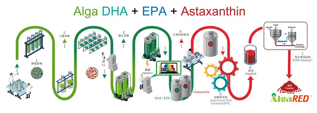 The production pathways of Omega-3s and Astaxanthin in AlagRED® consist of algae cultivation in close system, harvesting, drying, cell disruption, extraction, micro-encapsulation, spray drying and blending.